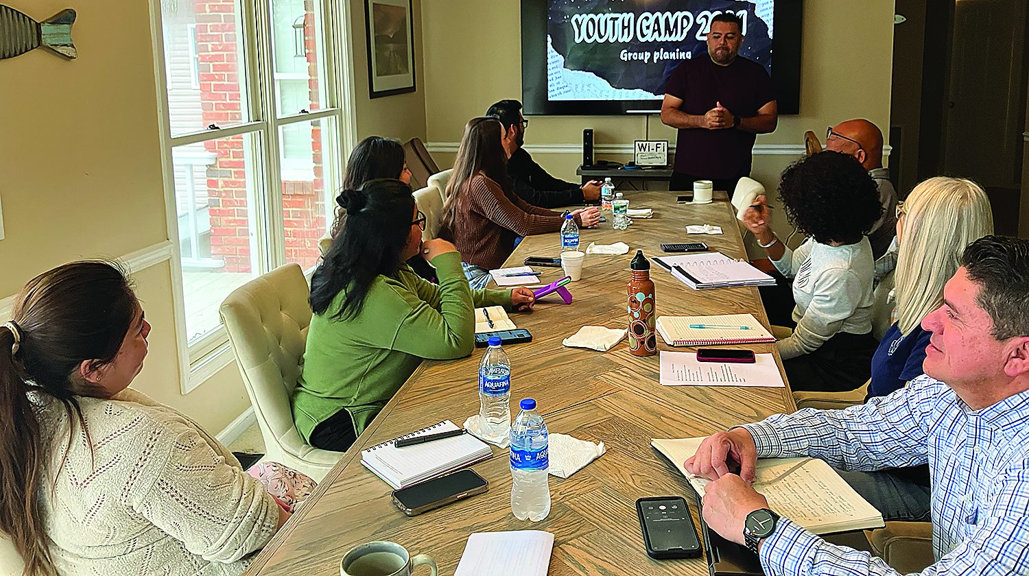 The Youth Retreat Planning Committee met March 8-9 near the event location at Camp Toccoa, GA. District Youth Director Jon Unzueta (standing) gave a presentation to the committee members: Joel and Sharon Modeste, Walter and Lilly Apen, Cesar Medrano, Keila Hernandez, Yanci Cartagena, and Jo Allison Krome, administrative director. The retreat will be held December 20-22, 2024, and will feature speakers Moises and Pete Capetillo.